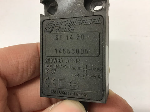 Schmersale ST 14 20 Safety Interlock Switch 250 volt 6 Amp Return Policy Returns accepted within 30 days. Items sold as is cannot be returned, unless description is in error. Buyer pays return freight. Shipping Policy We ship almost all items with 1 business day of cleared payment. We ship USPS and UPS. We can ship on your account. If you will be shipping freight, please be sure to provide all delivery contact information including a phone number. We will need to know if you have a fork lift or dock.