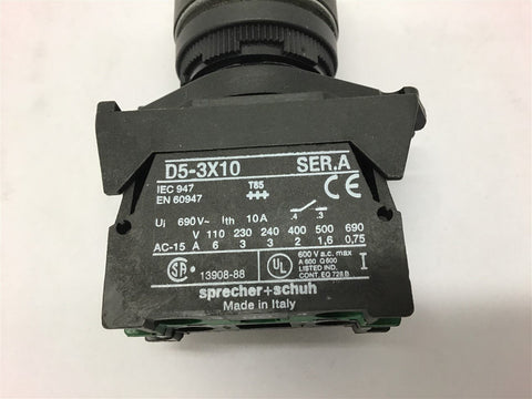 Sprecher+Schuh D5-3X01 Green Momentary Switch 690V 10A Return Policy Returns accepted within 30 days. Items sold as is cannot be returned, unless description is in error. Buyer pays return freight. Shipping Policy We ship almost all items with 1 business day of cleared payment. We ship USPS and UPS. We can ship on your account. If you will be shipping freight, please be sure to provide all delivery contact information including a phone number. We will need to know if you have a fork lift or dock.