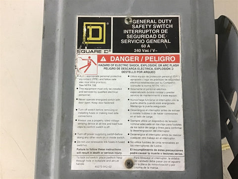 Sqaure D 60 Amp General Purpose Fused Safety Switch 240 Vac Return Policy Returns accepted within 30 days. Items sold as is cannot be returned, unless description is in error. Buyer pays return freight. Shipping Policy We ship almost all items with 1 business day of cleared payment. We ship USPS and UPS. We can ship on your account. If you will be shipping freight, please be sure to provide all delivery contact information including a phone number. We will need to know if you have a fork lift or dock.