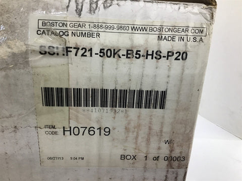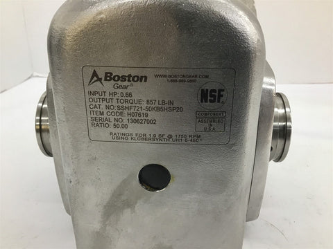 Boston Gear SSHF721-50K-B5-HS-P20 Right Angle Speed Reducer 0.66 HP 857 Torque Return Policy Returns accepted within 30 days. Items sold as is cannot be returned, unless description is in error. Buyer pays return freight. Shipping Policy We ship almost all items with 1 business day of cleared payment. We ship USPS and UPS. We can ship on your account. If you will be shipping freight, please be sure to provide all delivery contact information including a phone number. We will need to know if you have a fork lift or dock.