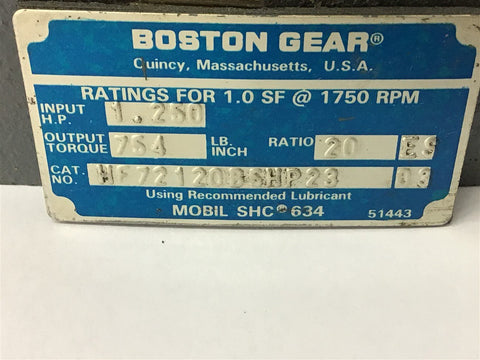 Boston HF72120B5HP23 20:1 Ratio Hollow Shaft Gear Reducer 1.250 Input Hp Return Policy Returns accepted within 30 days. Items sold as is cannot be returned, unless description is in error. Buyer pays return freight. Shipping Policy We ship almost all items with 1 business day of cleared payment. We ship USPS and UPS. We can ship on your account. If you will be shipping freight, please be sure to provide all delivery contact information including a phone number. We will need to know if you have a fork lift or dock.