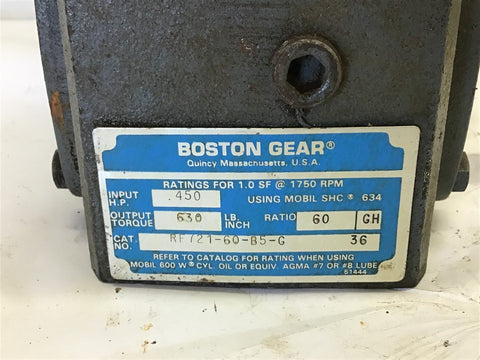 Boston RF721-60-B5-G Left Angle Gear Reducer 60:1 Ratio .450 Input HP Return Policy Returns accepted within 30 days. Items sold as is cannot be returned, unless description is in error. Buyer pays return freight. Shipping Policy We ship almost all items with 1 business day of cleared payment. We ship USPS and UPS. We can ship on your account. If you will be shipping freight, please be sure to provide all delivery contact information including a phone number. We will need to know if you have a fork lift or dock.