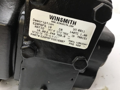 Winsmith E20MSFS 10DR140TC E20MSFS32160B7Gear Reducer Ratio 10:1 Input 2.240 Return Policy Returns accepted within 30 days. Items sold as is cannot be returned, unless description is in error. Buyer pays return freight. Shipping Policy We ship almost all items with 1 business day of cleared payment. We ship USPS and UPS. We can ship on your account. If you will be shipping freight, please be sure to provide all delivery contact information including a phone number. We will need to know if you have a fork lift or dock.