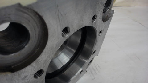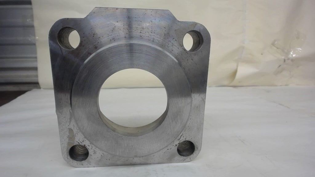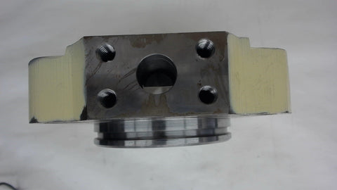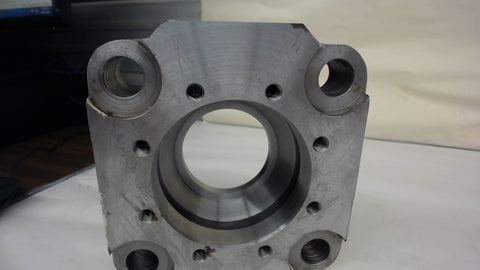 WITH .693" H RAISED ROUND (4.50" OD) CENTER WITH O RING GROOVE .209WIDTH---4 MOUNTING HOLES .809 D----8EA 3/8"-16 TAPPED HOLES----RAM EXIT HOLE 2-5/8" ID----3/4" INLET HOLE WITH 4 EACH 3/8"-16 TAPPED HOLES---INTERNAL OIL GROOVE 7/16" W X .708" D----3.680" BORE----PLEASE REFER TO PICTURES----NEW---NO MANUFATURER PART NUMBER LISTED----8/15---JC