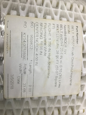NEW SURPLUS--OPENED FACTORY BOX----8/23/SJM--Belt Length 28.00 FT (55.07) Square Ft Flight 1.000 In High Streamline White: Non Std. Rods Belt Belt Width 23.6 " +/-0.10 36 Links --Per Ronnie