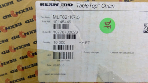 Rexnord MLF851K7.5 Table Top Chain 10 Feet New Surplus--Opened Factory Box---3/25--JLVCC 161448---SS302-T-2122-1-1---17.00