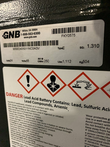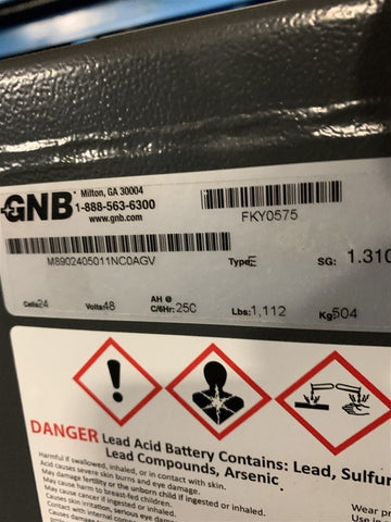 GNB M8902405011NC0AGV FKY0575 Type E 48 volt AGV Battery 24 Cells 250 AH Return Policy Returns accepted within 30 days. Items sold as is cannot be returned, unless description is in error. Buyer pays return freight. Shipping Policy We ship almost all items with 1 business day of cleared payment. We ship USPS and UPS. We can ship on your account. If you will be shipping freight, please be sure to provide all delivery contact information including a phone number. We will need to know if you have a fork lift or dock.
