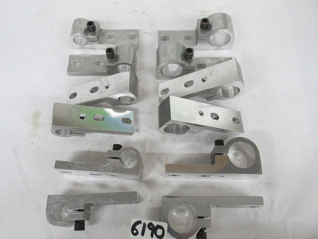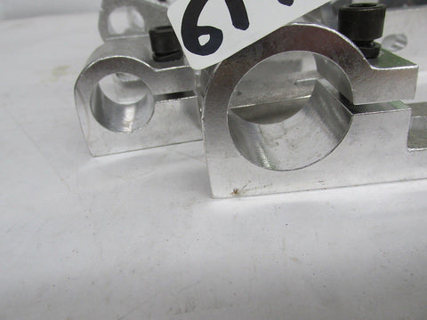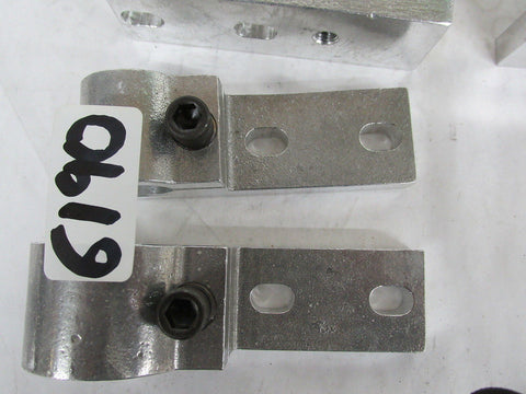 BUYING 23 PIECES TOTAL ALUMINUM HANGERS , EACH ONE HAS 2 EACH 3/8" OVAL MOUNTING HOLES AS PICTURED AND EACH HAS 1 3/8" SOCKET HEAD COMPRESSION SCREW , 6 PIECES ALUM. - 4 7/8"L X 1 1/2" W X 1/2" THICK X 1 " BORE AND 6 PIECES ALUMINUM 5 1/2"L X 1 1/2" W X 1/2" THICK X 1 1/2" BORE. NEW. 6190 C-M-4-D 8 LBS.