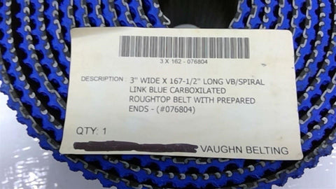 Vaughn Belting 076804 3"W X 167 1/2"L VB/Spiral Link Roughtop Belt Prepared End Return Policy Returns accepted within 30 days. Items sold as is cannot be returned, unless description is in error. Buyer pays return freight. Shipping Policy We ship almost all items with 1 business day of cleared payment. We ship USPS and UPS. We can ship on your account. If you will be shipping freight, please be sure to provide all delivery contact information including a phone number. We will need to know if you have a fork lift or dock.