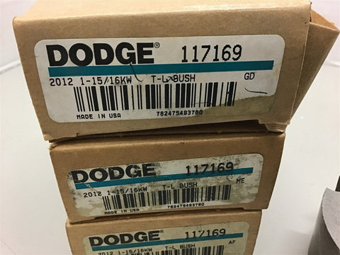 Dodge 2012 1 15/16 Taper Lock Bushing 117169 Lot of 3 Return Policy Returns accepted within 30 days. Items sold as is cannot be returned, unless description is in error. Buyer pays return freight. Shipping Policy We ship almost all items with 1 business day of cleared payment. We ship USPS and UPS. We can ship on your account. If you will be shipping freight, please be sure to provide all delivery contact information including a phone number. We will need to know if you have a fork lift or dock.