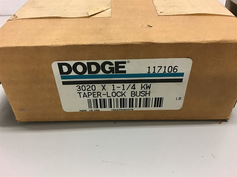 Dodge 3020 X 1 1/4 KW Taper Lock Bushing 117106 Return Policy Returns accepted within 30 days. Items sold as is cannot be returned, unless description is in error. Buyer pays return freight. Shipping Policy We ship almost all items with 1 business day of cleared payment. We ship USPS and UPS. We can ship on your account. If you will be shipping freight, please be sure to provide all delivery contact information including a phone number. We will need to know if you have a fork lift or dock.