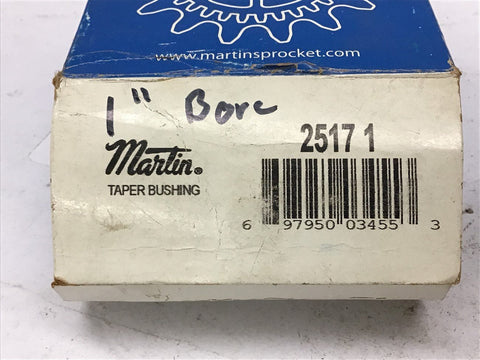 Martin 2517 Taper-Lock Bushing 1" Bore Return Policy Returns accepted within 30 days. Items sold as is cannot be returned, unless description is in error. Buyer pays return freight. Shipping Policy We ship almost all items with 1 business day of cleared payment. We ship USPS and UPS. We can ship on your account. If you will be shipping freight, please be sure to provide all delivery contact information including a phone number. We will need to know if you have a fork lift or dock.