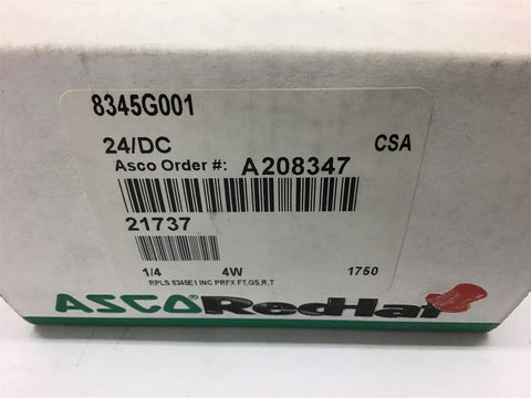 Asco 8345G001 Solenoid Valve 1/4" Pipe 4 Watts Return Policy Returns accepted within 30 days. Items sold as is cannot be returned, unless description is in error. Buyer pays return freight. Shipping Policy We ship almost all items with 1 business day of cleared payment. We ship USPS and UPS. We can ship on your account. If you will be shipping freight, please be sure to provide all delivery contact information including a phone number. We will need to know if you have a fork lift or dock.