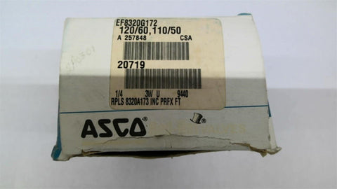 Asco EF8320G172 Solenoid Valve 1/4" 3 Watt 120 Volts Return Policy Returns accepted within 30 days. Items sold as is cannot be returned, unless description is in error. Buyer pays return freight. Shipping Policy We ship almost all items with 1 business day of cleared payment. We ship USPS and UPS. We can ship on your account. If you will be shipping freight, please be sure to provide all delivery contact information including a phone number. We will need to know if you have a fork lift or dock.