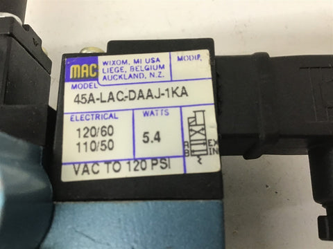 Mac 45A-LAC-DAAJ-1KA Solenoid Valve 5.4 Watts 120 Psi 120 Volt Return Policy Returns accepted within 30 days. Items sold as is cannot be returned, unless description is in error. Buyer pays return freight. Shipping Policy We ship almost all items with 1 business day of cleared payment. We ship USPS and UPS. We can ship on your account. If you will be shipping freight, please be sure to provide all delivery contact information including a phone number. We will need to know if you have a fork lift or dock.