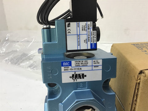 Mac 56C-13-111CA Solenoid Valve 150 PSI 130B-111CAAA 6.8 Watts 120 Volt Return Policy Returns accepted within 30 days. Items sold as is cannot be returned, unless description is in error. Buyer pays return freight. Shipping Policy We ship almost all items with 1 business day of cleared payment. We ship USPS and UPS. We can ship on your account. If you will be shipping freight, please be sure to provide all delivery contact information including a phone number. We will need to know if you have a fork lift or dock.