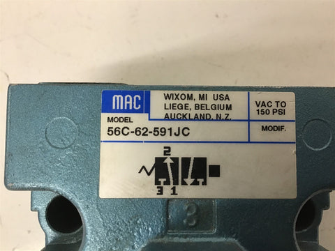 MAC 56C-62-591JC Solenoid Valve 150 PSI Return Policy Returns accepted within 30 days. Items sold as is cannot be returned, unless description is in error. Buyer pays return freight. Shipping Policy We ship almost all items with 1 business day of cleared payment. We ship USPS and UPS. We can ship on your account. If you will be shipping freight, please be sure to provide all delivery contact information including a phone number. We will need to know if you have a fork lift or dock.
