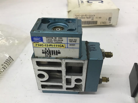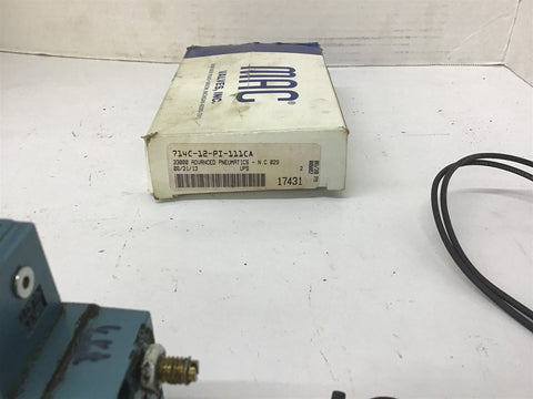 MAC 714C-12-PI-111CA Solenoid Valve Return Policy Returns accepted within 30 days. Items sold as is cannot be returned, unless description is in error. Buyer pays return freight. Shipping Policy We ship almost all items with 1 business day of cleared payment. We ship USPS and UPS. We can ship on your account. If you will be shipping freight, please be sure to provide all delivery contact information including a phone number. We will need to know if you have a fork lift or dock.