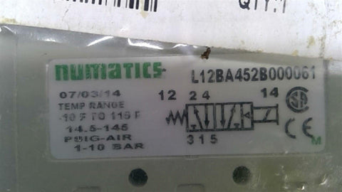 Numatics L12BA452B000061 Solenoid Valve 1-10 Bar Return Policy Returns accepted within 30 days. Items sold as is cannot be returned, unless description is in error. Buyer pays return freight. Shipping Policy We ship almost all items with 1 business day of cleared payment. We ship USPS and UPS. We can ship on your account. If you will be shipping freight, please be sure to provide all delivery contact information including a phone number. We will need to know if you have a fork lift or dock.