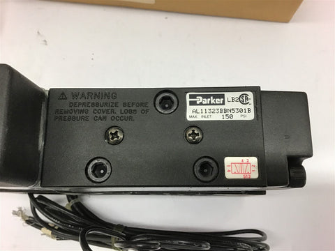 Parker AL11323BBN5301B Solenoid Valve 150 PSI Return Policy Returns accepted within 30 days. Items sold as is cannot be returned, unless description is in error. Buyer pays return freight. Shipping Policy We ship almost all items with 1 business day of cleared payment. We ship USPS and UPS. We can ship on your account. If you will be shipping freight, please be sure to provide all delivery contact information including a phone number. We will need to know if you have a fork lift or dock.
