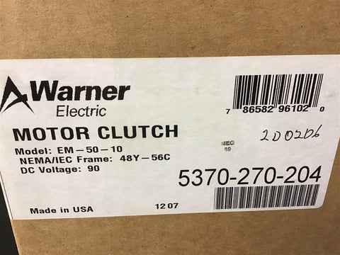 Warner Electric EM-50-10 Moor Clutch 90 Vdc 3600 Rpm 20 Wats 48Y-56C Frame Return Policy Returns accepted within 30 days. Items sold as is cannot be returned, unless description is in error. Buyer pays return freight. Shipping Policy We ship almost all items with 1 business day of cleared payment. We ship USPS and UPS. We can ship on your account. If you will be shipping freight, please be sure to provide all delivery contact information including a phone number. We will need to know if you have a fork lift or dock.