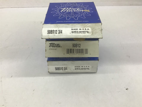 Martin 50B12 Sprocket 50 Chain 12 Teeth 3/4" Bore Lot Of 3 Return Policy Returns accepted within 30 days. Items sold as is cannot be returned, unless description is in error. Buyer pays return freight. Shipping Policy We ship almost all items with 1 business day of cleared payment. We ship USPS and UPS. We can ship on your account. If you will be shipping freight, please be sure to provide all delivery contact information including a phone number. We will need to know if you have a fork lift or dock.