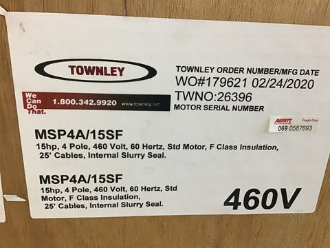 Townley MSP4-A/15SF 15 HP 460 V 4 P 60 Hz 25' Cable Return Policy Returns accepted within 30 days. Items sold as is cannot be returned, unless description is in error. Buyer pays return freight. Shipping Policy We ship almost all items with 1 business day of cleared payment. We ship USPS and UPS. We can ship on your account. If you will be shipping freight, please be sure to provide all delivery contact information including a phone number. We will need to know if you have a fork lift or dock.