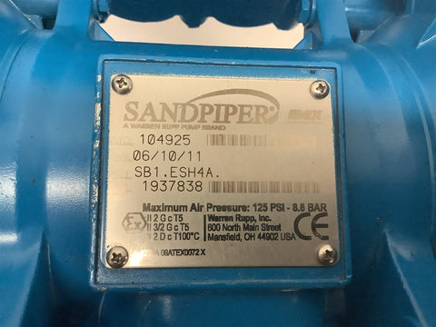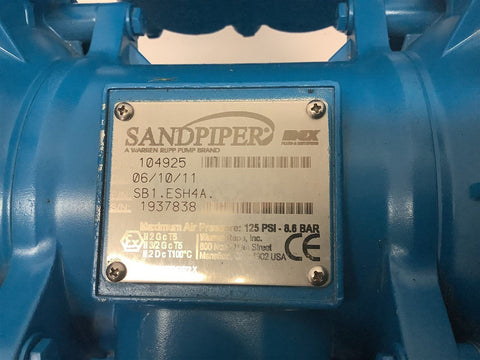 Warren Rupp Sandpiper SB1ESH4A1937838 125 Psi Diaphragm Pump Return Policy Returns accepted within 30 days. Items sold as is cannot be returned, unless description is in error. Buyer pays return freight. Shipping Policy We ship almost all items with 1 business day of cleared payment. We ship USPS and UPS. We can ship on your account. If you will be shipping freight, please be sure to provide all delivery contact information including a phone number. We will need to know if you have a fork lift or dock.
