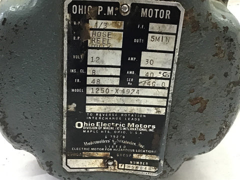 1250-X4924 1/3 HP Hose Reel Duty Motor 12 Volts 48 Frame Return Policy Returns accepted within 30 days. Items sold as is cannot be returned, unless description is in error. Buyer pays return freight. Shipping Policy We ship almost all items with 1 business day of cleared payment. We ship USPS and UPS. We can ship on your account. If you will be shipping freight, please be sure to provide all delivery contact information including a phone number. We will need to know if you have a fork lift or dock.