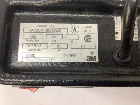 3M 496 6.5 Amp 60 Hz 115 Volts Toner Vacuum USA Made 496 Return Policy Returns accepted within 30 days. Items sold as is cannot be returned, unless description is in error. Buyer pays return freight. Shipping Policy We ship almost all items with 1 business day of cleared payment. We ship USPS and UPS. We can ship on your account. If you will be shipping freight, please be sure to provide all delivery contact information including a phone number. We will need to know if you have a fork lift or dock.
