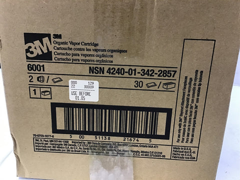 3M 6001 NSN 4240-01-342-2857 Organic Vapor Cartridge 30 Return Policy Returns accepted within 30 days. Items sold as is cannot be returned, unless description is in error. Buyer pays return freight. Shipping Policy We ship almost all items with 1 business day of cleared payment. We ship USPS and UPS. We can ship on your account. If you will be shipping freight, please be sure to provide all delivery contact information including a phone number. We will need to know if you have a fork lift or dock.
