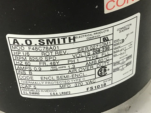 A.O. Smith FS1018 1/6 Hp Fan Motor 208-230 Volts 825 Rpm 2 Speed 48Y Frame Return Policy Returns accepted within 30 days. Items sold as is cannot be returned, unless description is in error. Buyer pays return freight. Shipping Policy We ship almost all items with 1 business day of cleared payment. We ship USPS and UPS. We can ship on your account. If you will be shipping freight, please be sure to provide all delivery contact information including a phone number. We will need to know if you have a fork lift or dock.