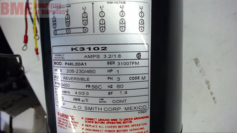 A.O. SMITH P48L2DA1 AC MOTOR 1 HP, 208-230/460 VOLTS 3450 RPM, 56C FRAME