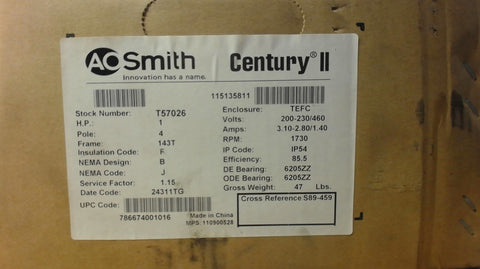 A.O. Smith, T57026, 1 Hp,200-230/460 Volts, 1730 Rpm, 4P, 143T Frame, Ac Motor