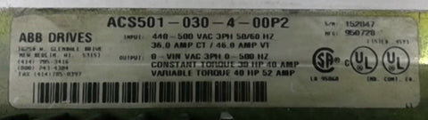 ABB Drives ACS501-030-4-00P2 Drive 3 Phase 40 Amp 30 Hp Return Policy Returns accepted within 30 days. Items sold as is cannot be returned, unless description is in error. Buyer pays return freight. Shipping Policy We ship almost all items with 1 business day of cleared payment. We ship USPS and UPS. We can ship on your account. If you will be shipping freight, please be sure to provide all delivery contact information including a phone number. We will need to know if you have a fork lift or dock.