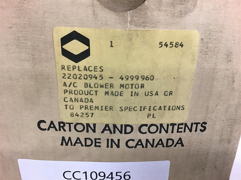 AC Blower Motor Replaces 22020945 4999960 Return Policy Returns accepted within 30 days. Items sold as is cannot be returned, unless description is in error. Buyer pays return freight. Shipping Policy We ship almost all items with 1 business day of cleared payment. We ship USPS and UPS. We can ship on your account. If you will be shipping freight, please be sure to provide all delivery contact information including a phone number. We will need to know if you have a fork lift or dock.