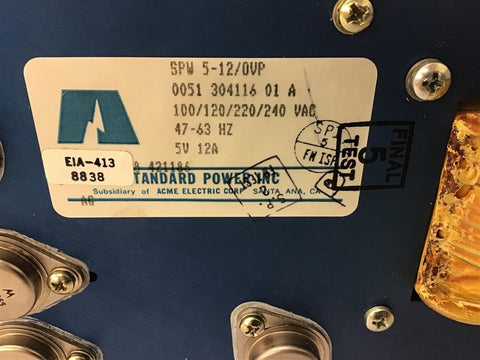 Acme Electric SPW 5-12-OVP Electric Power Supply 5V 12A USIP 100/120/220/240 Vac Return Policy Returns accepted within 30 days. Items sold as is cannot be returned, unless description is in error. Buyer pays return freight. Shipping Policy We ship almost all items with 1 business day of cleared payment. We ship USPS and UPS. We can ship on your account. If you will be shipping freight, please be sure to provide all delivery contact information including a phone number. We will need to know if you have a fork lift or dock.