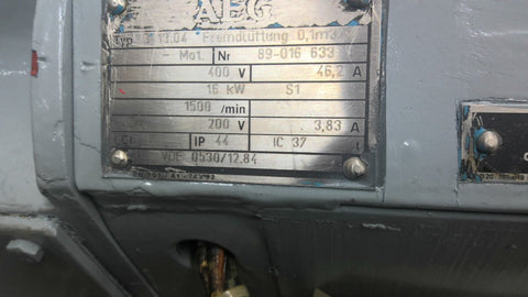 AEG B 13.04 Fremdluftung 0.1m3 AC 16kW 1500 Rpm 200 Volts 46.2 Amp Return Policy Returns accepted within 30 days. Items sold as is cannot be returned, unless description is in error. Buyer pays return freight. Shipping Policy We ship almost all items with 1 business day of cleared payment. We ship USPS and UPS. We can ship on your account. If you will be shipping freight, please be sure to provide all delivery contact information including a phone number. We will need to know if you have a fork lift or dock.