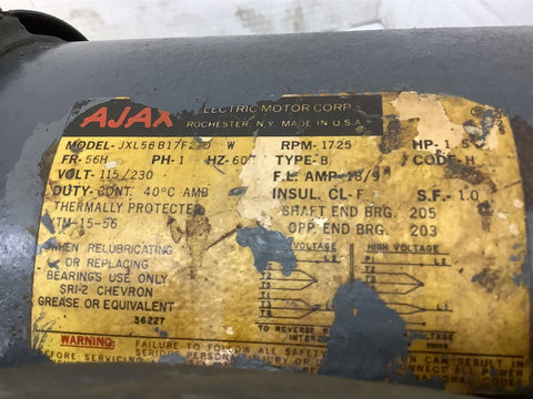 Ajax JXL56B17F270 AC Motor 1-1/2HP 115/230V 1725RPM 56H FR 1PH 60HZ TEFC Return Policy Returns accepted within 30 days. Items sold as is cannot be returned, unless description is in error. Buyer pays return freight. Shipping Policy We ship almost all items with 1 business day of cleared payment. We ship USPS and UPS. We can ship on your account. If you will be shipping freight, please be sure to provide all delivery contact information including a phone number. We will need to know if you have a fork lift or dock.