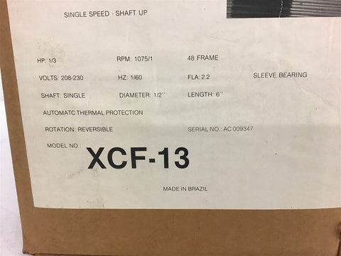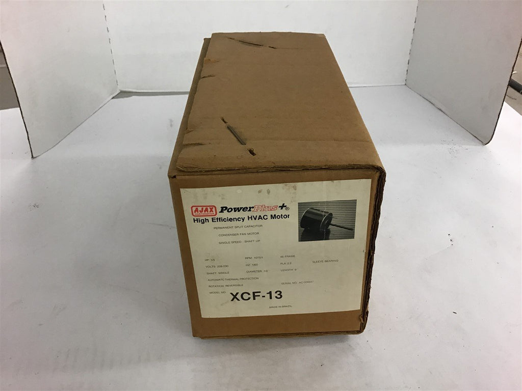 Ajax XCF-13 Fan Motor 1/3 HP 1075 Rpm 208-230 Volts single Phase Return Policy Returns accepted within 30 days. Items sold as is cannot be returned, unless description is in error. Buyer pays return freight. Shipping Policy We ship almost all items with 1 business day of cleared payment. We ship USPS and UPS. We can ship on your account. If you will be shipping freight, please be sure to provide all delivery contact information including a phone number. We will need to know if you have a fork lift or dock.