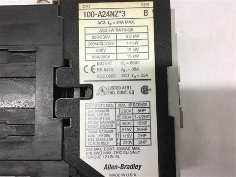 Allen-Bradley 100-A24NZ*3 Contactor 460 Volt @ 15 HP 24 VDC Coil Return Policy Returns accepted within 30 days. Items sold as is cannot be returned, unless description is in error. Buyer pays return freight. Shipping Policy We ship almost all items with 1 business day of cleared payment. We ship USPS and UPS. We can ship on your account. If you will be shipping freight, please be sure to provide all delivery contact information including a phone number. We will need to know if you have a fork lift or dock.