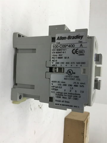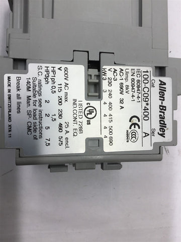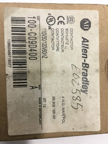 Allen-Bradley 100-C09D400 Contactor 120 Volt Coil 460 Volts @ 5HP Return Policy Returns accepted within 30 days. Items sold as is cannot be returned, unless description is in error. Buyer pays return freight. Shipping Policy We ship almost all items with 1 business day of cleared payment. We ship USPS and UPS. We can ship on your account. If you will be shipping freight, please be sure to provide all delivery contact information including a phone number. We will need to know if you have a fork lift or dock.