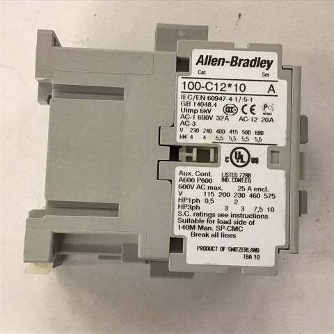 Allen-Bradley 100-C12D10 Contactor 7 1/2 HP 460 Volt 120 Volt Coil Return Policy Returns accepted within 30 days. Items sold as is cannot be returned, unless description is in error. Buyer pays return freight. Shipping Policy We ship almost all items with 1 business day of cleared payment. We ship USPS and UPS. We can ship on your account. If you will be shipping freight, please be sure to provide all delivery contact information including a phone number. We will need to know if you have a fork lift or dock.