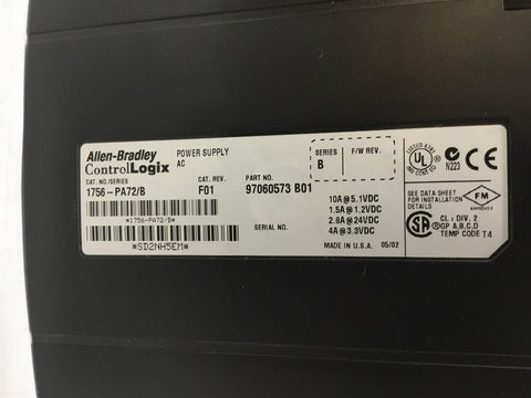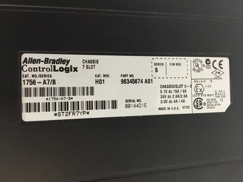 Allen Bradley 1756-A7/B Chassis 7 Slot with 1756-PA72/B Power Supply Return Policy Returns accepted within 30 days. Items sold as is cannot be returned, unless description is in error. Buyer pays return freight. Shipping Policy We ship almost all items with 1 business day of cleared payment. We ship USPS and UPS. We can ship on your account. If you will be shipping freight, please be sure to provide all delivery contact information including a phone number. We will need to know if you have a fork lift or dock.