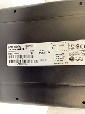 Allen-Bradley 1756-A7/B Control Logix 7 Slot Chassis w/ 1756-PA72/B Return Policy Returns accepted within 30 days. Items sold as is cannot be returned, unless description is in error. Buyer pays return freight. Shipping Policy We ship almost all items with 1 business day of cleared payment. We ship USPS and UPS. We can ship on your account. If you will be shipping freight, please be sure to provide all delivery contact information including a phone number. We will need to know if you have a fork lift or dock.