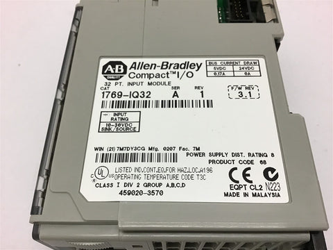 Allen Bradley 1769-IQ32 Compact 32 PT. Input Module Ser A Rev 1 Return Policy Returns accepted within 30 days. Items sold as is cannot be returned, unless description is in error. Buyer pays return freight. Shipping Policy We ship almost all items with 1 business day of cleared payment. We ship USPS and UPS. We can ship on your account. If you will be shipping freight, please be sure to provide all delivery contact information including a phone number. We will need to know if you have a fork lift or dock.