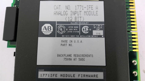 Allen Bradley 1771-IFE A Analog Input Module (12 Bit) Return Policy Returns accepted within 30 days. Items sold as is cannot be returned, unless description is in error. Buyer pays return freight. Shipping Policy We ship almost all items with 1 business day of cleared payment. We ship USPS and UPS. We can ship on your account. If you will be shipping freight, please be sure to provide all delivery contact information including a phone number. We will need to know if you have a fork lift or dock.