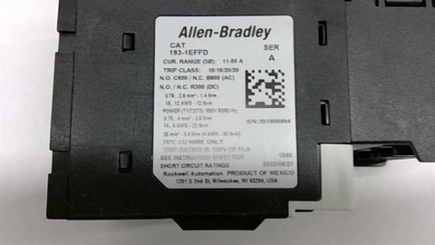 Allen Bradley 193-1EFFD Overload Relay E100 11-55 Amp Return Policy Returns accepted within 30 days. Items sold as is cannot be returned, unless description is in error. Buyer pays return freight. Shipping Policy We ship almost all items with 1 business day of cleared payment. We ship USPS and UPS. We can ship on your account. If you will be shipping freight, please be sure to provide all delivery contact information including a phone number. We will need to know if you have a fork lift or dock.