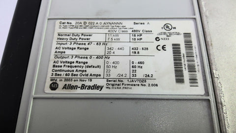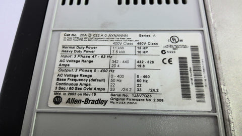 Allen Bradley 20AD022A0AYNANNN AC Drive 15 HP 460V 3PH 400HZ 22AMPS