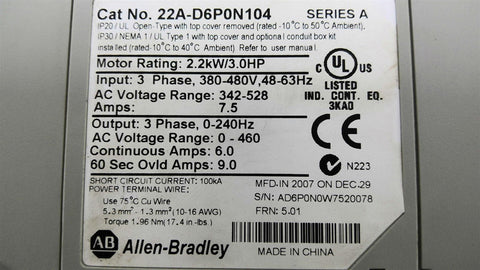 Allen-Bradley 22A-D6P0N104 PowerFlex 3 Hp AC Drive 460 Volts